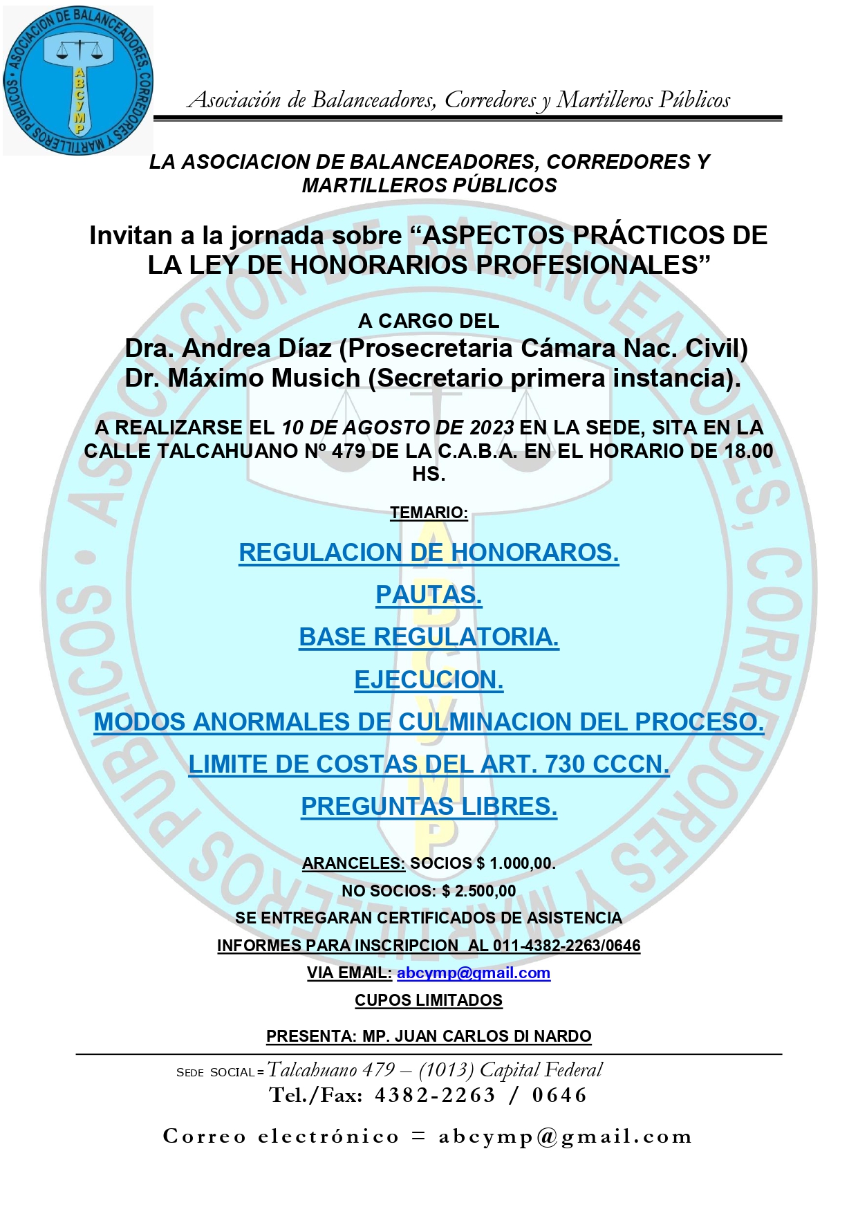 ARANCELES: SOCIOS $ 1.000,00. NO SOCIOS: $ 2.500,00